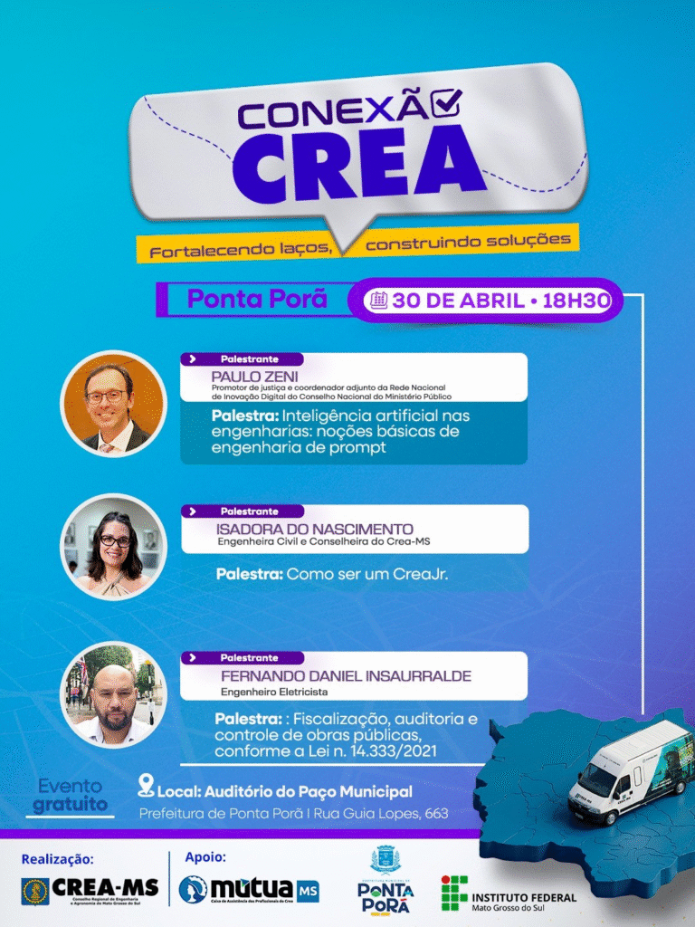 O Conexão Crea chega a Ponta Porã com uma programação focada em inovação, tecnologia e gestão, para profissionais e estudantes da fronteira. As palestras gratuitas ocorrerão no Auditório do Paço Municipal (Rua Guia Lopes, 663), na quinta-feira (30), às 18h30.