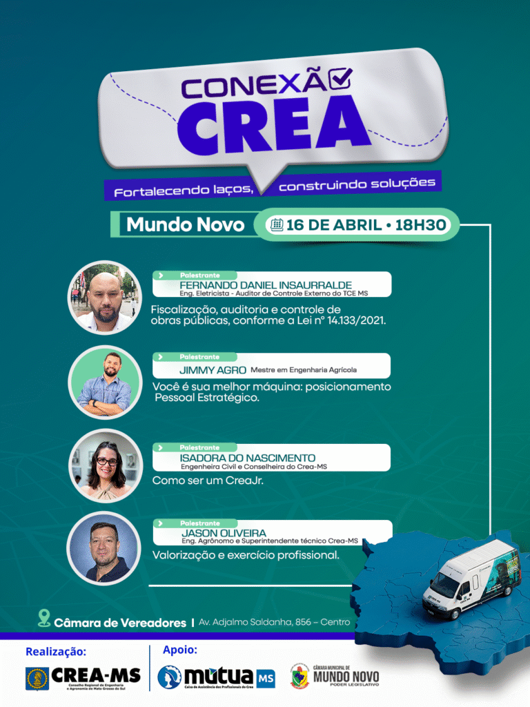 O Conselho Regional de Engenharia e Agronomia de Mato Grosso do Sul (Crea-MS) realiza, nesta quinta-feira (16), em Mundo Novo, a quarta edição do Conexão Crea de 2026. O evento é gratuito e objetiva promover a atualização técnica e o networking entre profissionais e estudantes das engenharias, agronomia e geociências de Mundo Novo e região.
