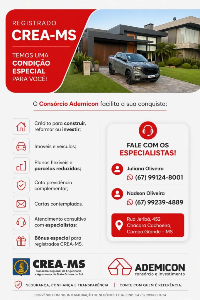 Mais informações podem ser obtidas com a Ademicon pelos telefones (67) 99124-8001 ou (67) 99239-4889 ou pessoalmente na Rua Jeribá, 454, Chácara Cachoeira, Sala 14, em Campo Grande.