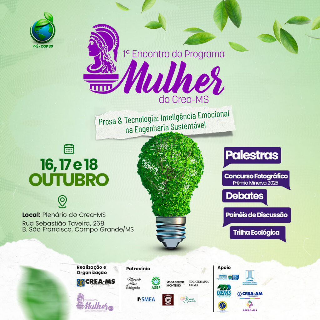 O Crea-MS, por meio de seu Programa Mulher, promove o 1º Encontro do Programa Mulher, que reunirá líderes, profissionais e estudantes em um espaço de diálogo sobre sustentabilidade, inovação e liderança feminina, alinhado às discussões globais que antecedem a COP30.